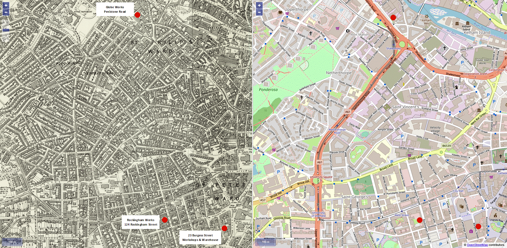 The founder’s son, Philip Henry Unwin, was evidently being readied to join the business. He became a Freeman of the Company of Cutlers in 1868, having completed his apprenticeship to his uncle, John Walters. In the early 1870s, Unwin & Rodgers was still making a splash at exhibitions. At the London International Exhibition in 1873, the firm was amongst the largest exhibitors of cutlery. Its display of over 250 items was praised for the ‘absolute honesty of the work’, because it eschewed unnecessary showiness (Sheffield Independent, 19 May 1873). Besides the usual pistol-knives, South American daggers and plantations knives were displayed, as an indication of the firm’s interest in new overseas markets. In the same year, Unwin & Rodgers offered for sale the freehold of the Rockingham Street workshops, as a prelude to complete removal to Globe Works. In 1875, Unwin & Rodgers adopted limited liability, with a nominal capital of £40,000 (with £26,000 initially paid up by the vendors). Average profits over 15% on turnover were claimed in the prospectus. The flotation was prompted by the elderly founder’s withdrawal from the firm (Sheffield Daily Telegraph, 6 October 1875). Philip Unwin, ‘gentleman’, Collegiate Crescent, died on 26 October 1878 (aged 78) and was buried in the General Cemetery. He left under £2,000. He had taken no part in public life and his newspaper death notice was no more than a couple of lines.