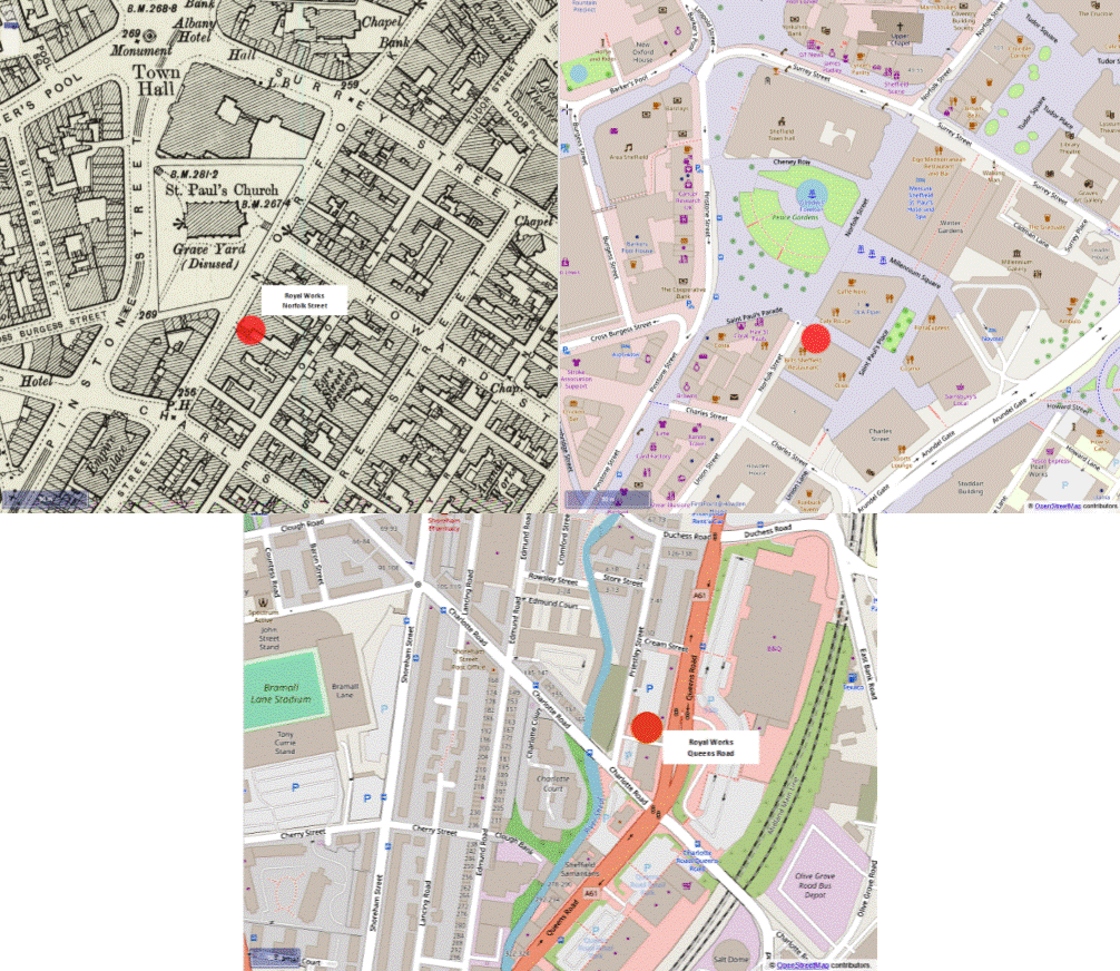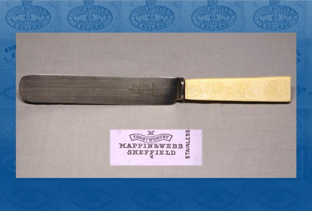 In 1922, Mappin & Webb vacated Norfolk Street and moved into The Royal Works at Queen’s Road. It was a modern three-storey block, built in ferro-concrete, which was located at the junction with Charlotte Road (opposite the Midland Railway sidings). A commemorative booklet described a fully integrated factory with electro-plating shop, cross-rolling plant, and buffing shops (Mappin & Webb, 1922). But the factory also had a traditional cutlers’ workshop and a ‘hull’, where knife blades were still hand-ground. As a nod to the past, inside the entrance gates was a small group of hand forgers. The workforce probably surpassed 500. The factory fed Mappin & Webb’s London shops and the overseas retail subsidiaries. In the 1920s, cutlery blades were still made of ‘best forged’ carbon steel, though stainless table knives had made their appearance. Handles were either made in ‘Prince’s Plate’ and hand-soldered to the blades, or utilised ‘TUSCA’ (an ivory substitute for handles). Huge contract orders were fulfilled for the Admiralty, steamship and railway companies, leading hotels, restaurants, and caterers.