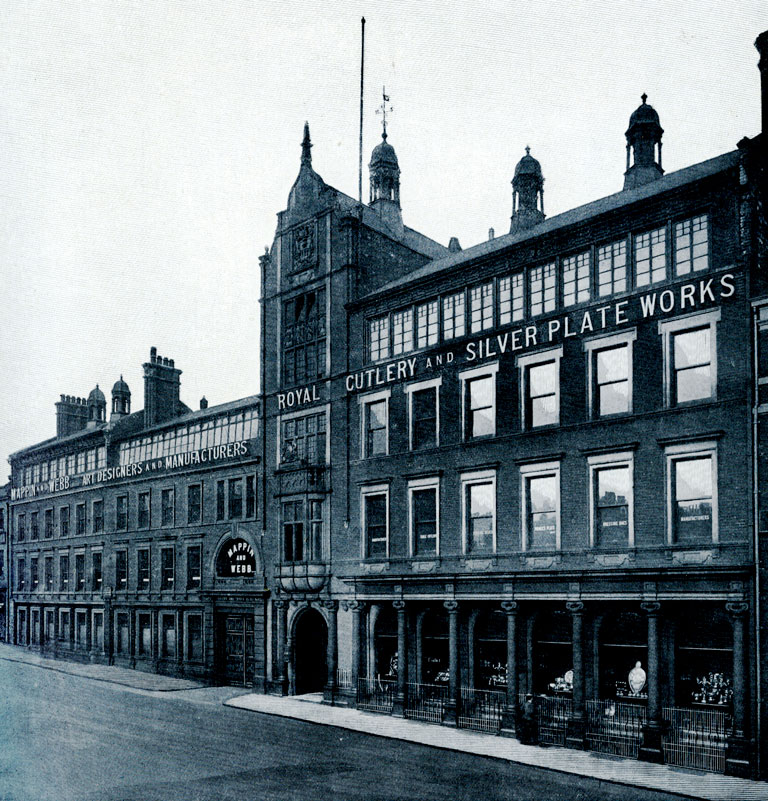 With a Royal Warrant (1896) and agencies around the world, the Royal Cutlery & Plate Works of Mappin & Webb had eclipsed the old Queen’s Works. In 1898, Mappin & Webb embraced limited liability. The firm was capitalised at £250,000, but no shares were issued to the public. Ownership was in the hands of J. Newton Mappin and his sons: Walter John (1868-1943), Herbert Joseph (1872-1946), and Stanley Arthur (1873-1924). Goldsmiths & Silversmiths Co decided to sell Mappin Bros and in 1902 J. N. Mappin acquired it. He established ‘Mappin & Webb (Mappin Bros incorporated)’, thus bringing an end to a family feud that had extended half a century. The Baker’s Hill factory was vacated and demolished and the workforces of the two businesses were combined. In that year, the company was reconstructed as Mappin & Webb (1908) Ltd, with a share capital of £400,000. At the same time, Mappin & Webb established Sheffield Silver Plate & Cutlery Co for mass-produced cutlery. In 1913, the name Mappin & Webb Ltd was adopted. The number of employees was apparently about a thousand.