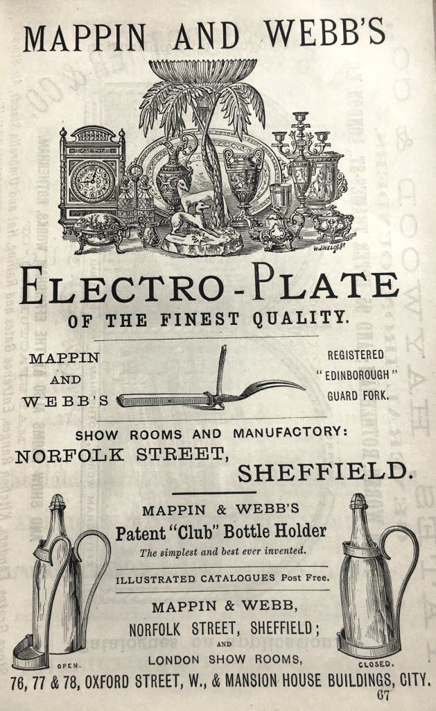 Meanwhile, Frederick’s brother John Newton launched a new electro-plate and cutlery business, Mappin & Co, at The Royal Cutlery Works in Pond Hill. In 1860, the company registered a silver mark. Almost immediately, Mappin Bros sued to prevent the use of the name. J. N. Mappin lived at Heathfield Lodge, Clapham Park. Nearby lived the family of George Webb, who was a wine and spirit merchant. In 1860, J. N. Mappin married Webb’s daughter, Ellen Elizabeth, at a Unitarian chapel in Brixton. He recruited Ellen’s brother, George Webb Jun. (1833-1881), as a partner. Mappin Bros failed in their legal challenge, but nevertheless J. N. Mappin changed the company’s name: first to Mappin, Webb & Co, and then by 1868 to Mappin & Webb & Co. The partnership flourished. In 1868, The Royal Cutlery Works was based in Eyre Street. Soon the address was Norfolk Street, where Mappin & Webb occupied an ‘enlarged manufactory’ and showrooms (Sheffield Independent, 5 September 1870). London was central to the firm’s ambitions, where it had showrooms at Oxford Street and Corn Hill. In 1872, the architect John Belcher was commissioned to build a landmark Gothic-style London head office for Mappin & Webb at Mansion House. Further silver marks were registered in 1864, 1876, 1882, 1892, and 1894.