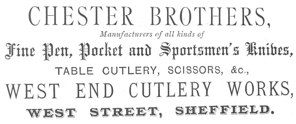 Chester Bros, horn and ivory merchant, was then formed in Trippet Lane. All the Chester clan seem to have followed the ivory and horn trade: however, not every brother was apparently involved with Chester Bros. The original partners were William and John. However, William died, aged 36, on 10 December 1864. John continued the firm with his other brothers, though the premises in Holly Street and Trippet Lane were sold (Sheffield Independent, 7 December 1867). By 1871, Henry, Charles Richard, and Joseph had joined Chester Bros in West Street. The firm remained a horn and ivory merchant: however, at West End Cutlery Works, West Street, the firm also manufactured pen, pocket, and sportsman’s knives, table cutlery, and scissors. In 1881, John Chester – who was living with his sister and brother Charles Richard in Broomspring Lane – told the Census that he employed five men, two women, and a boy. (John’s wife was Eliza, the daughter of Abraham Levick.) Evidently, Chester Bros had its share of skilled cutlers. It produced a Fitzwilliam Knife in gold and pearl, with eleven articles, which included a special blade/gadget that functioned as a cartridge extractor, a spanner for striker nuts, and a wire cutter for champagne bottles (Sheffield Independent, 23 January 1880).