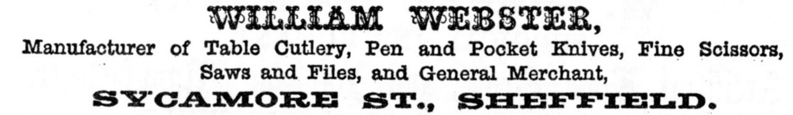 Between about 1839 and 1846, William Webster apparently partnered Henry and Christopher Johnson (possibly the later owner of Western Works). Webster & Johnson was dissolved in 1846. William Webster then took sole control of the Sycamore Street premises. He followed the usual trajectory for the prospering Sheffield merchant: he was Master Cutler in 1851 and by the 1860s had a substantial Victorian villa, Shirley House, which still stands in Psalter Lane. He died there on 9 April 1866, aged 62, and was buried in Ecclesall churchyard. He left under £18,000.