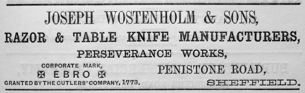 In 1856, Joseph Wostenholm & Sons advertised as a manufacturer of razors and cutlery in Leicester Street. Four years later, the enterprise was operating from Meadow Street, where besides making razors the owner was running a beer house. In 1857, Joseph was bankrupt. By 1863, the firm was operating from Perseverance Works in Penistone Road and Wostenholm’s son, also named Joseph, took over. One corporate mark was ‘2565’. Another was the word ‘EBRO’, apparently granted in 1773, and assigned to Joseph Wostenholm in 1864. In that year, he advertised Bowie and scalp knives. In 1868, the firm advertised as a razor and table knife manufacturer. Joseph Wostenholm, the founder, died on 30 April 1876. He left under £750.