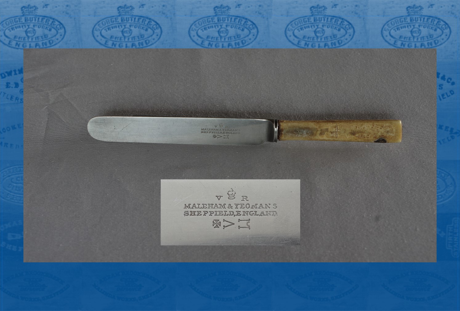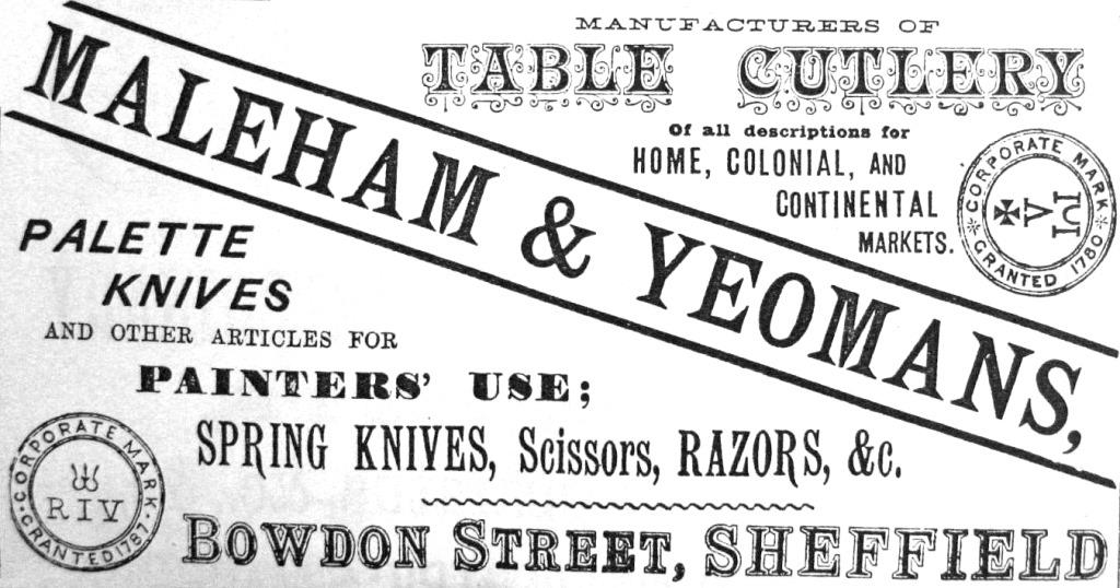 The partners were George Edgar Maleham (1850-1922) and Thomas Shillito(e) Yeomans (1852-1940). In 1871, they were living in a house in Daniel Hill, Upperthorpe, with Thomas’s father, John. Thomas was the grandson of John Yeomans, a cutlery merchant. George and Thomas were apprentice merchants. By 1876, they had started Maleham & Yeomans and advertised steel, tools and ‘Superior Table Cutlery’. The address of the company – which clearly involved factoring – was Burgess Works in Burgess Street. By 1879, the address was Bowdon Street/Milton Street. George and Thomas lived in 45 Victoria Road, Broomhall Park. In 1881, the firm employed 37 workers. It sold table cutlery, but its advertisements (as in the 1887 directory) emphasized palette knives and other assorted knives for painters. It also sold spring knives, scissors, and razors. Its product line was similar to William Bradshaw & Son, whose trade mark (a Maltese Cross and the horizontal letters V and M) was adopted in 1884 by Maleham & Yeomans. Another trade mark used was ‘RIV’ (granted in 1787). A silver mark was registered in Sheffield in 1901. An old Maleham & Yeomans’ sales catalogue featured smokers’ knives, sport’s knives, and various types of pruning and pen knives.
