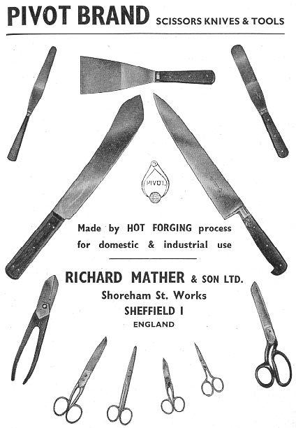 By the end of the 1950s, Harold’s son, Alan Mather (1919-1975) – though he had trained as an architect – became the fourth generation head of the company. Harold Mather, of Northumberland Road, died on 1 April 1965 at Hallamshire Golf Course. He left £30,630. In the same year, the company was sold. The assets and goodwill in scissors manufacturer was acquired by Ernest Wright. Gilbert Brightmore died on 21 November 1988, leaving about £70,000. Mather’s trade mark was ‘PIVOT’. A brief account of the company was published in Quality, April 1959