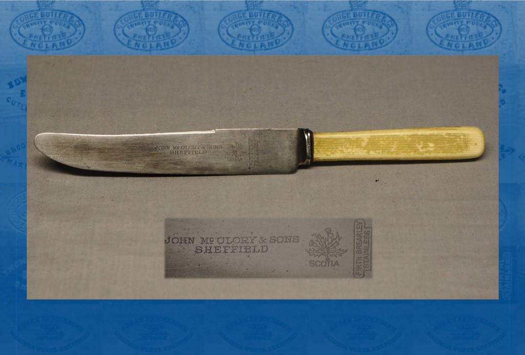 John’s son, John Lewis McClory (1881-1935), became chairman. He was assisted before the War by Henry Elliott; and after 1915 by George Henry Street (1873-1929). J. L. McClory had been sent as a teenager to study German machine methods; and Street was an advocate of mass production. Consequently, in the 1920s McClory’s was one of the first to market stainless table cutlery and mechanise blade grinding. J. L. McClory died at his home, The Gables, Hathersage, on 10 February 1935, aged 53, leaving £1,790. Dedicated to his business, his obituary was headlined ‘Man Employees Worshipped’ (Sheffield Daily Independent, 11 February 1935). McClory’s was liquidated in 1938. The name and mark (‘SCOTIA’ and a thistle) re-appeared, first at Radford Street and then Herries Road (owner Hiram Wild).