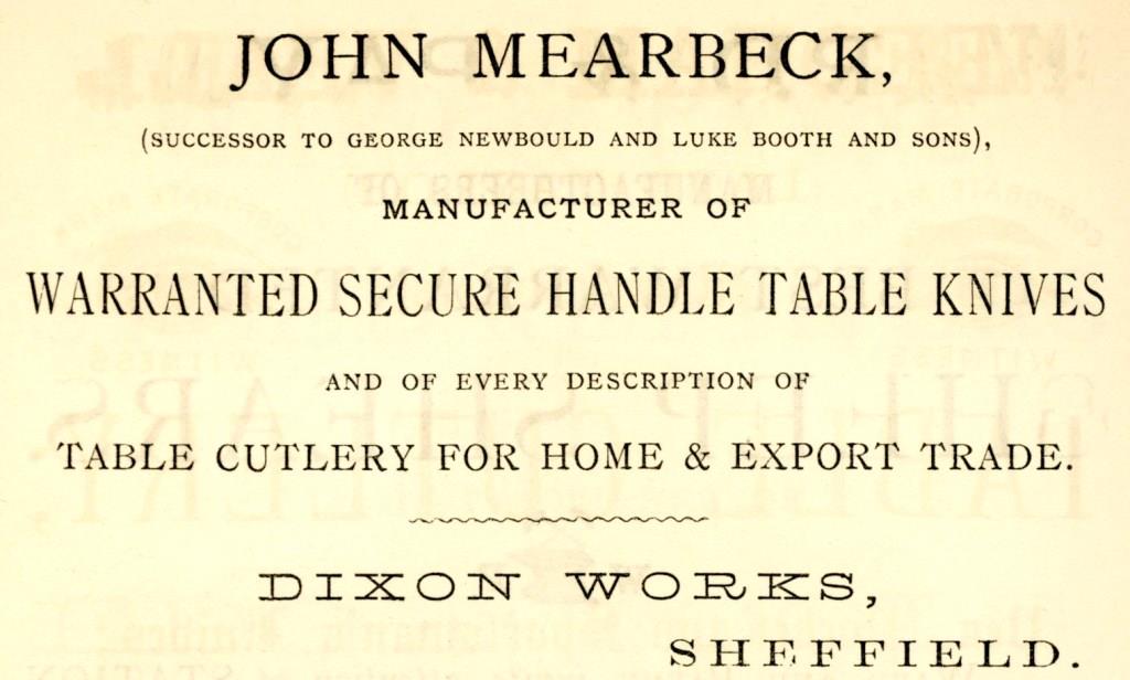 John Mearbeck (1838-1922) was the son of Thomas Mearbeck (d. 16 May 1854, aged 74) and his wife, Elizabeth. His father was a lead and glass merchant, who lived in Mount Pisgah. By 1861, John was working as a cutlery merchant’s clerk, but by 1871 was enumerated in the Census as a farmer working 95 acres, with the help of three labourers. He returned to the cutlery industry, however, and in 1879 advertised in Pawson & Brailsford’s Illustrated Guide (1879) as a manufacturer of ‘secure handle’ table cutlery and as ‘successor’ to George Newbould and Luke Booth. In the 1881 Census, his workforce was enumerated as 25 men, eight women, three boys, and one girl. However, in the following year he was bankrupt with debts of £1,857 against assets of £506. Apparently, he continued to work as a manager in the cutlery industry. By the turn of the century, however, his wife Dorah was a ‘company house keeper’ on her own account in Blackpool and possibly John had moved there. John Mearbeck died at Deakin’s Walk, Ranmoor, on 30 March 1922, aged 84. He was a retired insurance agent. Dora died at the same address in 1925. They were buried at Crookes Cemetery.