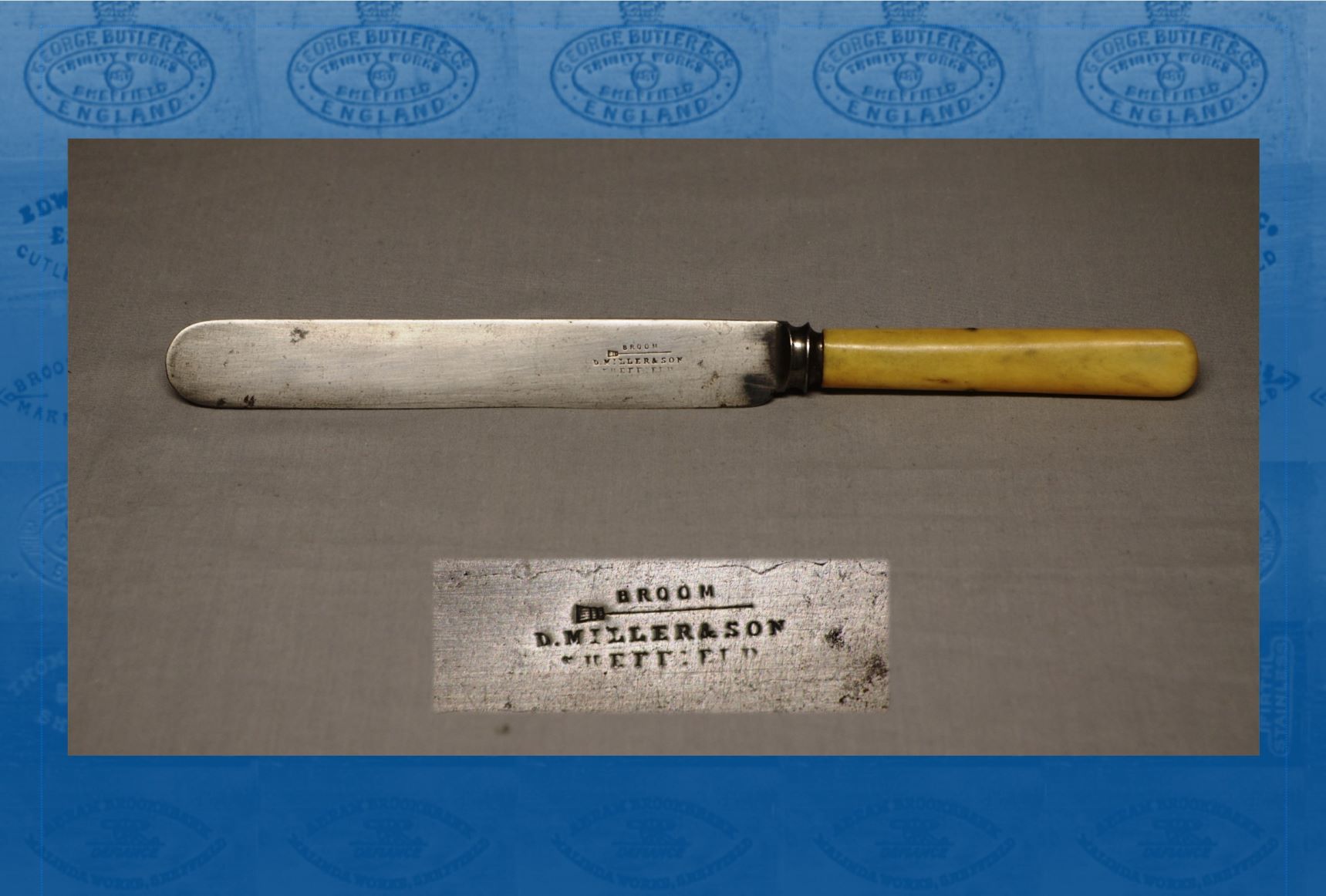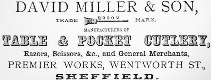David Miller was born in Brampton, Cumberland, in about 1794. By 1829, he was listed in Sheffield as an ironmonger, merchant, and table knife manufacturer in Orchard Street. Between 1833 and 1849, he was running a ‘Birmingham and Sheffield warehouse’ in Fargate. In about 1851, David Miller & Son was operating from Eldon Works in Eldon Street as a merchant and razor and spring knife manufacturer. In the 1850s, the founder lived at Tapton Ville with his wife, Jane, and son, Joseph. David Miller died at Tapton Ville on 20 March 1870, aged 76, and was buried in Ecclesall. He left under £5,000. Joseph died in Ranmoor on 30 August 1880, aged 54, and was buried in Fulwood. His estate was under £14,000. The leasehold warehouses in Eldon Street and the four-storey workshops at the back were offered for sale, along with the trade mark – a picture of a broom, which the firm had used since about 1851 (Sheffield Independent, 4 June 1881).