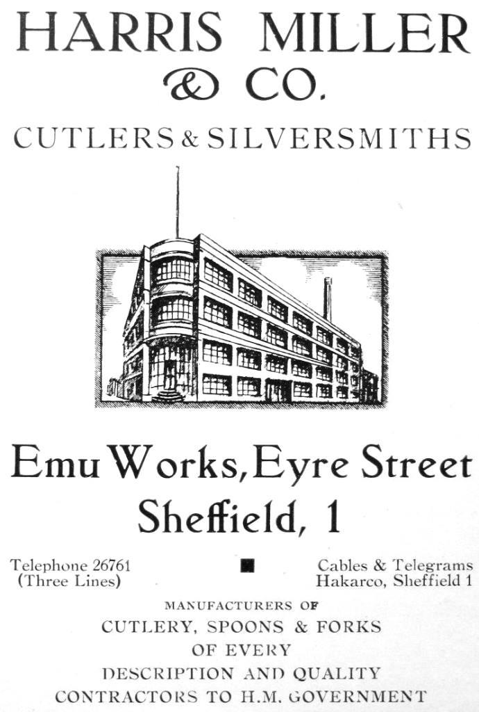 The founder, Harris Miller, was born in about 1875 at Koona, Russia. Frustratingly little else is known about his early life, except that he was Jewish and that he and his family apparently arrived in England in about 1900. By 1911, they were in Sheffield. In the Census of that year, ‘Harry’ Miller was enumerated at Fawcett Street with his wife, Sarah, and several children. These included a daughter, Leah, and son, Bernard. Miller worked on his own account as a ‘draper-dealer’. In 1915, he switched to cutlery and started his own business. In 1922, Harris Miller & Co was listed in the Sheffield directory as a cutlery manufacturer at 92 Trafalgar Street and Court 3, Trafalgar Lane. By the mid-1920s, Miller had relocated to 51 Rockingham Street.