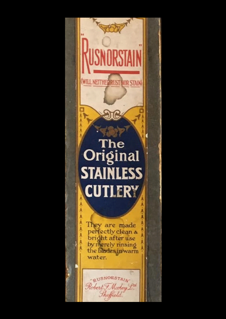 R. F. Mosley’s disguised link with Alexander Clark may account for his relatively low profile before 1914. That obscurity ended during the War. He and his company played a significant part in cutlery history, after metallurgist Harry Brearley (who worked for Firth’s, the steel makers) turned to them in the summer of 1914 to make a trial with his new ‘rustless’ steel. Even the best qualities of Mosley’s hand-forged shear steel inevitably tarnished and became rusty. The manager of Mosley’s, Ernest Stuart (1875-1937), helped Brearley forge a dozen or so knife blades from the new alloy – a milestone in cutlery manufacture. Consequently, Mosley’s was the first firm to predict a future for stainless steel and order supplies of the revolutionary alloy. In his account of the discovery of stainless steel, Brearley heaped praise on Stuart and Mosley’s (Brearley, 19414). According to Brearley, Mosley’s would have liked a monopoly on the product, but for various reasons supplies were limited. Intriguingly, when Mosley’s commercial blades appeared they were marked not ‘Firth-Brearley Stainless’ or ‘Firth Stainless’ – the most common markings on early stainless cutlery – but ‘RUSNORSTAIN’. Knives with this trade mark began appearing for sale in New South Wales in Australia as early as 1915 – showing how quickly Mosley commercialised the alloy. For example, an advertisement appeared in the Northern Star [Lismore, NSW] on 18 November 1915. The war disrupted supplies of stainless steel, but once it ended, Mosley also began shipping cutlery to New Zealand. In 1919, a Dunedin retailer placed a newspaper advertisement showing Mosley’s ‘RUSNORSTAIN’ table cutlery made to order.