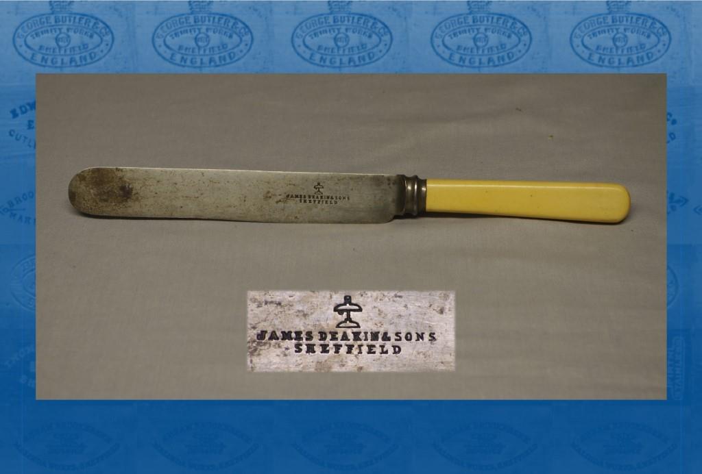 Deakin’s working-class roots were reflected in the location of his home at Prospect Place in the suburb of Heeley. His workforce was modest, too: in 1871, it was eight men, three boys and fifteen girls. However, he was able to bring his sons – William Pitchford (1846-1931), John (1848-1935), and Albert (1858-1937) – into the business. By 1871, it was known as James Deakin & Sons. In 1881, the workroll (according to the Census) was 170. The firm produced all types of silver and plated cutlery, including table and pocket knives. The trade mark was a shop counter bell; and the company registered silver marks in Sheffield in 1878, 1894, and 1896. Offices and showrooms were opened at 48 Holborn Viaduct, London, and in Glasgow and Belfast. Later the London office was at Charterhouse Street. Export markets included Australia, South Africa, India, and the Continent.