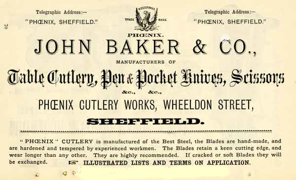 © SCC Picture Sheffield [y11986] - Advertisement c1889 for John Baker and Co., manufacturers of table cutlery, pen and pocket knives and scissors, Phoenix Cutlery Works, Wheeldon Street