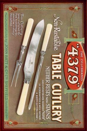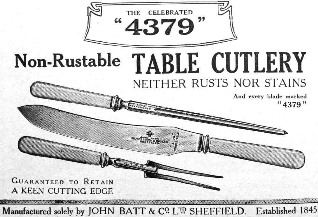 By the turn of the century, John C. Batt was head of the company, with his brother, Frederick, as company secretary. They lived at the same house in Manchester Road. Horace became an insurance broker; and William Henry left the firm. John C. Batt, Rosendale, Cairns Road, Crosspool, died on 29 October 1909, aged 48. He was buried in Ecclesall, leaving £4,267. Frederick and Bernard continued, with Sykes as chairman and Willis as a director. At the end of the War, Batt’s was one of the first to advertise ‘non-rustable’ (stainless) cutlery (Wilson & Twigg, 19192). Bernard B. Batt, Oak Hill Road, Nether Edge, died on 3 October 1919. He was buried in Ecclesall, leaving £2,160. Frederick E. Batt, Ecclesall Road, died on 16 April 1926, aged 60. He left £4,450. John Batt & Co Ltd apparently continued to trade, but it was not listed in a Sheffield directory after 1938.