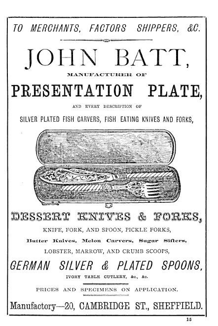 John Batt was born on 10 January 1830, the son of William Batt. Advertisements stated that John founded his silver-plate business in Arundel Street in 1845 (when he would have been fifteen), but a more accurate date would be 1866, when he left his father’s firm. In 1868, John Batt took out a full-page directory advertisement as a manufacturer in Arundel Street and Tudor Place of presentation plate and ‘every description’ of silver-plated table cutlery. He specialised in electro-plated goods, including silver fruit knives, butter knives, dessert knives, and fish carvers. By 1871, the address was Arundel Street, with Batt living in Albert Road, Heeley. By 1876, he had moved his enterprise to Cambridge Street and two years later registered his first silver mark. In 1881, John Batt employed fourteen workers. He died at his residence Studley House, Oakhill Road, on 2 November 1889, aged 59, and was buried in Ecclesall churchyard. He left £3,806. His widow, Hannah neé Cocker, was the daughter of a pioneer in the Sheffield Plate trade. She lived afterwards with her sister. They both died in 1925: Hannah was then aged 96 and her sister 99!