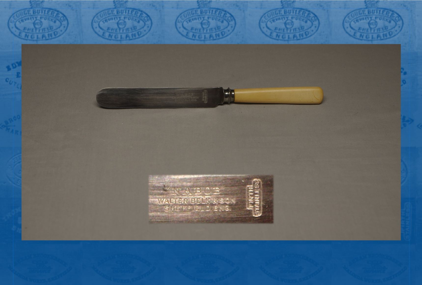 Hannah next married Henry Taylor, a razor whetter. By 1881, when they resided in Heeley, Walter was an errand boy. By 1891, he was a cutlery etcher and gilder. He became a ‘manager’ and started his own firm in 1915 at Kingsley Works, Young Street. He specialised in razors, cutlery, and electro-plate. His sons – Cecil Blackmore, Walter Rupert, and Cedric Kingsley – joined him. Another partner, F.A. Lester, withdrew in 1920. The trade marks were ‘NABOB’ and ‘KINGSLEY PLATE’. The firm ceased trading in about 1931. Walter Belk, Edgedale Road, died on 25 November 1937, leaving £262.