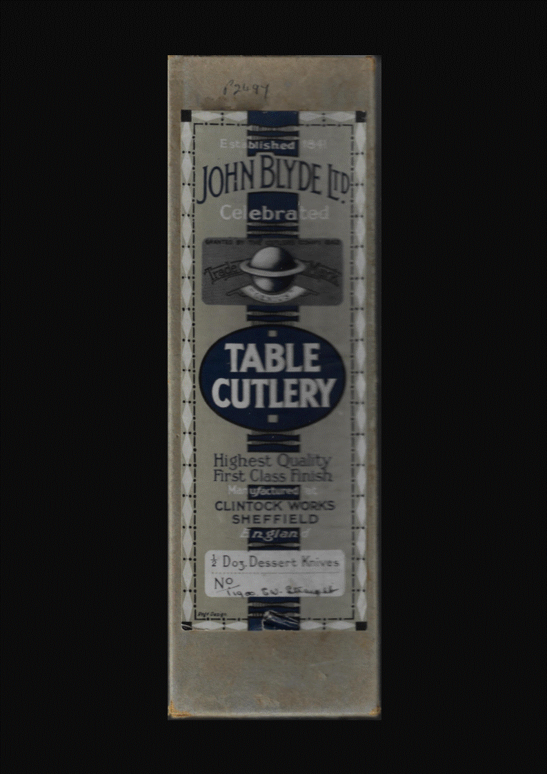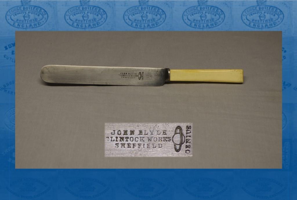 A. J. Blyde died on 24 April 1920, leaving £8,378 (over £1,000 of which was left to Harriet Elizabeth Driver, a manager in the business). Blyde’s successor was his managing director, Harold Bryars (1877-1955), who in 1918 had registered the firm as ‘Ltd’ (capital £5,000) and taken over Greenhough. Blyde’s switched almost entirely to hand-forged surgical scissors. A profile in Quality (March 1957) stated that it was the last surgical scissors house that could hand forge scissors of any description. In the 1970s, Blyde’s was wound up. The corporate marks were the planet Saturn above the word ‘GENIUS’ (used on scissors and cutlery); and a golfer (‘SURE & FAR’) on pen and pocket knives (formerly Greenhough’s mark).