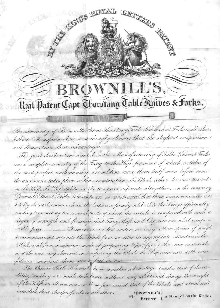 John Brownill (variously spelled Brownhill or Brownell) was baptised in Sheffield on 21 July 1776, the son of James, a cutler. By 1821, John was listed in Hollis Croft as the ‘sole manufacturer of patent table knives and forks’. He advertised a ‘Thoro’tang’ table knife and fork, in which the handle was secured by a cap soldered to the end of the tang. Gell & Bennett’s, Sheffield & Commercial Directory (1821) featured a fold-out advertisement for this patent. In 1821, Brownill became involved in Thorpe, Wragg & Co. However, he died on 15 February 1822, aged 45, was buried at St Peter’s. He had been known as ‘Second-the-motion-Brownhill’, because of his propensity to second anything at Masters’ committees (Leader, 18761). This helped distinguish him from his brother, Jonathan. His widow and executrix, Elizabeth, issued a statement regarding the knife handle patent (‘originally granted to Jonathan Brownell’) and later assigned to John Brownell. She announced that as holder of the patent, she was determined to maintain her right (Sheffield Independent, 19 April 1823).