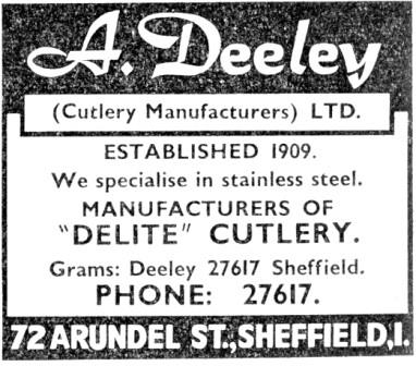 According to its advertisements, Deeley’s was established in 1909. The owner was George Alfred Deeley (1885-1959), who was born in Sheffield, the son of Samuel Edward Deeley (a silversmith) and his wife, Annie. In 1911, George was a spoon and fork filer at 19 Carver Street. His small-scale operation did not always appear in directories. In 1925, however, George Alfred Deeley & Co, cutlery manufacturer, was listed at 19 Carver Street. Deeley was insolvent in 1928, but apparently continued to operate. In 1939, George Alfred described himself in the Register of England & Wales as a ‘machine spoon and fork filer own account’. By the end of the Second World War, Deeley was based at 72 Arundel Street, which was the tenement-style factory of W. & S. Butcher. The firm was styled A. Deeley & Co. It advertised spoon and forks and cutlery in The Ironmonger Diary (1950). George Alfred Deeley later lived at Knedlington Road, Howden, near Goole, and died on 28 March 1959, aged 73. He left £2,711 and a widow, Edith. His unconsecrated burial was at Abbey Lane Cemetery.
