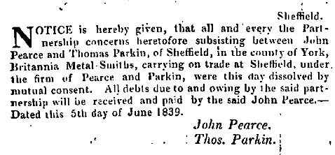 Joseph Pearce (c.1757-1838) was a cutler, who married Sarah Booth in 1787 and had two sons: John (bapt. 24 January 1796-1860) and Joseph Jun. (bapt.31 August 1788-1868). Like their father, the sons became razor makers in Gibraltar Street, though Joseph Jun. later became a bookseller and stationer (information from Mike Osborn). Joseph Pearce Sen. died on 3 February 1838, aged 81. By the 1830s, John had moved to Angel Street/Snig Hill, where he combined razor manufacture with cutlery dealing; and briefly partnered Britannia smith Thomas Parkin. In 1842, his only daughter, Ann, married Henry Hobson, who became Pearce’s manager. In 1843, Pearce and Hobson answered charges at the Town Hall that they had marked blades of common steel as ‘cast steel’ (Sheffield Independent, 30 September 1843).