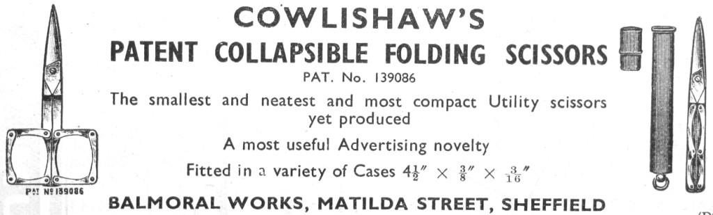 By 1918, Cowlishaw’s name had been acquired by Arthur Theodore Smith (1874-1962). When the trade in silver fruit-knives was hit by stainless steel, Smith adapted by selling folding scissors and a folding knife / fork / spoon combination. Cowlishaw’s (later a limited company) was based at various addresses in the twentieth century: Napier Street, Harrow Street, and Matilda Street. Arthur T. Smith, of Osberton Place, Cowlishaw Road, died on 22 December 1962, leaving £1,879. Emil Berek later owned the name. The firm was still listed as a cutler at Portland Works, Hill Street, in the early 1970s.