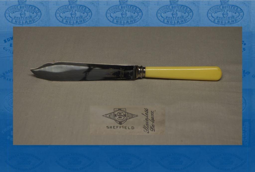 In 1939, Samuel was living with his wife, Celia, at Endcliffe Grove Avenue (1939 England & Wales Register). He continued to trade during the War, but by the late 1940s the company had metamorphosed into Crusade (Cutlery) Ltd. The address was Crusade Works, Johnson Lane and Andrew Street. In 1947, it was an exhibitor at the British Industries Fair, Olympia, London. The firm manufactured (or factored) cutlery, spoons, forks, canteens, cabinets, hotel ware, butchers’ and trade knives and flatware. These were made in ‘STAYBRITE’ stainless steel, EPNS, and chromium plate. In 1951, the firm was voluntarily wound up (the year after The Ironmonger Diary carried an advertisement for the firm). According to Whitham & Sykes (1953), the mark was owned by Hubert Heald (owner of Charles Heald). Later it passed to Rockingham Plate Ltd. Samuel Viner, of 17 Collegiate Crescent, died in Sheffield on 22 September 1969. He was buried in Sheffield Jewish Cemetery, leaving £4,941.