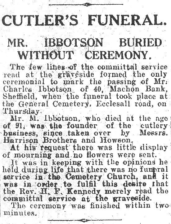 Until he was sixty, Ibbotson’s crippled leg necessitated the use of a metal stand. But when he reached 68, he decided to have the leg amputated. Even then, he stayed on as a manager at Harrison Bros & Howson. He did not retire until he was 86, when his eyesight was failing. Charles Ibbotson, Machon Bank, died on 14 April 1927, aged 91. At his funeral, he had requested no mourning and no display, so the graveside service at the General Cemetery took only two minutes. He left £4,062.