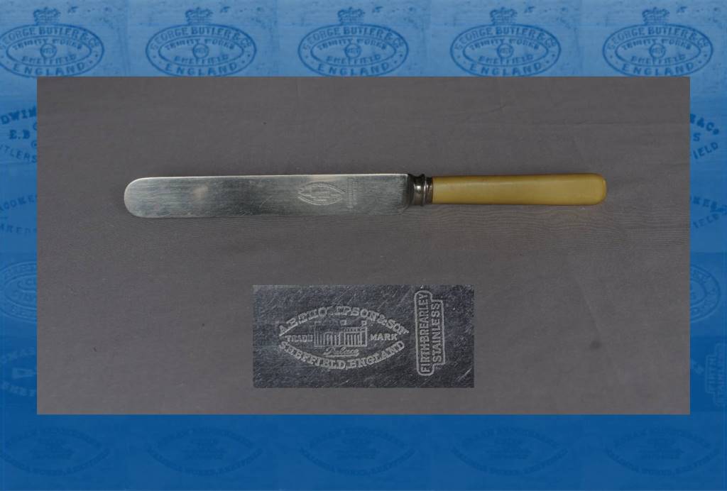 A. E. Thompson & Son was first listed as a cutlery manufacturer in 1925 at 41 Bowdon Street. The firm specialised in stainless table cutlery and cased goods. Thompson and his son were finishers and packagers rather than manufacturers. They targeted the cheaper end of the market, which evidently involved compromises in a tough trading environment. In 1927, Henry Arthur Thompson made a public apology to Cutlers’ Hall for making table knives marked ‘Best English Cutlery’, when the quality did not warrant that description (Sheffield Daily Telegraph, 10 November 1927). In 1930, the firm was fined £5 (plus 5 guineas costs) for selling dessert knives stamped ‘Firth Stainless’, when analysis showed that the cutlery was made from stainless steel that was not Firth’s (Sheffield Daily Telegraph, 10 October 1930).
