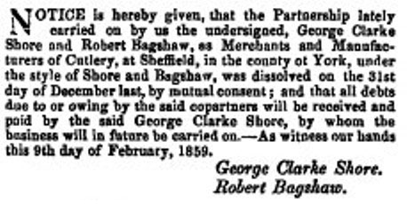 This business was launched by George Clarke Shore, who was born in Gainsborough, Lincolnshire, in about 1805. He was listed in Sheffield in 1841 as a commercial traveller. By 1845, he was described as a cutlery merchant and manufacturer, Broom Parade. By then, he had joined Joseph Fenton to establish Fenton & Shore – the forerunner of Joseph Fenton & Sons. In 1857, the partnership with Fenton was dissolved. Shore & Bagshaw then appeared (with Robert Bagshaw), but this was dissolved in 1859. Shore decided to organise his own business (perhaps because his sons had come of age).