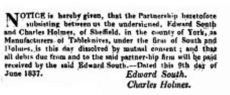 Edward South (1800-1885) was born in Sheffield, apparently the son of Francis (a cutler) and Sarah. Edward became a partner with Charles Holmes in South & Holmes, a table knife manufacturer. This ended in 1837. South was listed in 1841 as a table knife manufacturer in Fitzwilliam Street. Four years later he advertised in a local directory. By the 1870s, the output included spear, dagger, and hunting knives. Helped by his son, John, Edward South employed 38 workers in 1851, though that fell to less than ten after the 1850s. Edward South died on 4 July 1885, aged 76, and was buried in the General Cemetery. The table knife business (styled E. South & Co by the end of the 1890s) remained in Fitzwilliam Street until 1912, when it apparently ceased trading.