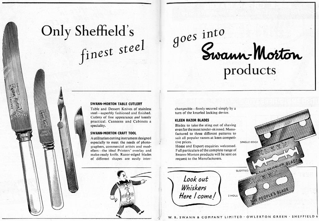 In the Register of Engalnd & Wales (1939), Swann was enumerated as ‘chairman and technical director of a surgical scalpel and razor blade manufacturer’; Morton as a ‘working manager director safety razor blades’; and Thorp (Fairweather) as ‘superintendent of production … surgical instrument and safety razor’. Morton left the company after the War and was chairman of a small foundry at Chesterfield, when he died in a car crash on 9 May 1968, aged 64. Co-directors Swann and Fairweather (who continued to use her maiden name) oversaw the post-war expansion of the business, which was re-incorporated in 1948. The demand for surgical blades had boomed during the war and razor blade manufacture was soon abandoned. In the early 1950s the firm advertised table cutlery (though there is no evidence so far that any knives were sold). Swann’s was based at Penn Works, Owlerton Green. Despite tax problems after the war, the company thrived, with a workforce of about a hundred. By 1957, the firm was producing 38 million surgical blades each year.