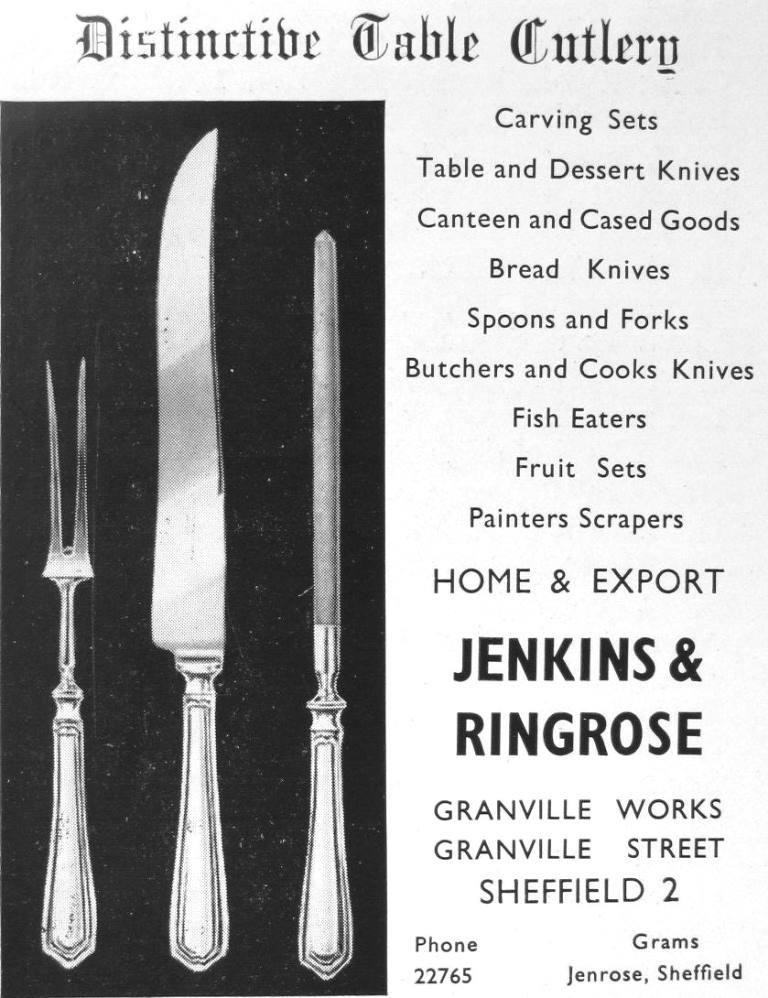 Jenkins died in 1943 and was buried in Norton, but Jenkins & Ringrose continued at Granville Street. In 1952, an advertisement in International Cutler offered a range of cutlery: carving sets, table and dessert knives, canteens, bread knives, butchers’ and cooks’ knives, and painters’ scrapers. It had apparently ceased trading by the end of the 1950s. No trade mark has been traced.