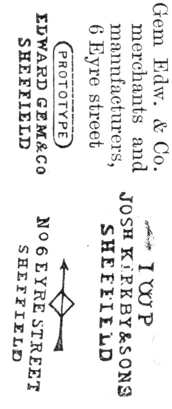 Edward Gem (c.1811-1905) was the son of Roger Williams Gem (1774-1855), a Birmingham solicitor, and his wife, Ellen Sophia Ball (1774-1852). Edward became established as a Birmingham hardware merchant, based in Charlotte Street, Birmingham. In about 1856, he began operating a Sheffield office, Moilliet & Gem (with James and Theodore Moilliet). It was based in Eyre Street and Birmingham, with Thomas Ingall as agent. However, this partnership was dissolved in 1858. By 1860, Gem was listed as a Sheffield cutlery merchant and ‘manufacturer’ on his own account, with Ingall as manager. Gem stocked a full range of cutlery, including table, pen, and pocket knives, razors, and scissors. The firm used, inter alia, the word ‘PROTOTYPE’ as a trade mark; and acquired marks from Stacey, Pease, Joseph Kirkby & Sons, and Brittain, Wilkinson & Brownell. Another mark was an arrow through a diamond (picture), above the office address: 6 Eyre Street.