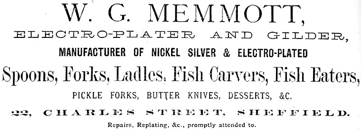 Walter George Memmott (1845-1892) was the son of William Memmott and his wife Ann. Walter’s father was a saw maker in Arundel Lane, but he was trained as a silver finisher (later working as a spoon and fork polisher). Between 1872 and 1881, Walter operated in Charles Street as an electro-plate manufacturer. In 1881, he employed five men and two boys. Memmott lived in Woodseats, with his wife Mary Emma and several sons (Arthur Joseph Rawstone, Walter George, Herbert, William James, and Harry), who later became the Memmott ‘brothers’. However, in 1881 Walter G. Memmott became insolvent with debts over £1,000 (against assets of £360) and his business was liquidated. He was soon trading again in Stanley Works (Backfields) and Pool Works (Burgess Street), but his business ceased in 1884. Three years later, he was jailed for three months for receiving stolen cutlery (Sheffield Independent, 14 July 1887). He died in Albert Road, Heeley, on 1 July 1892, aged 47, and was buried in the General Cemetery.