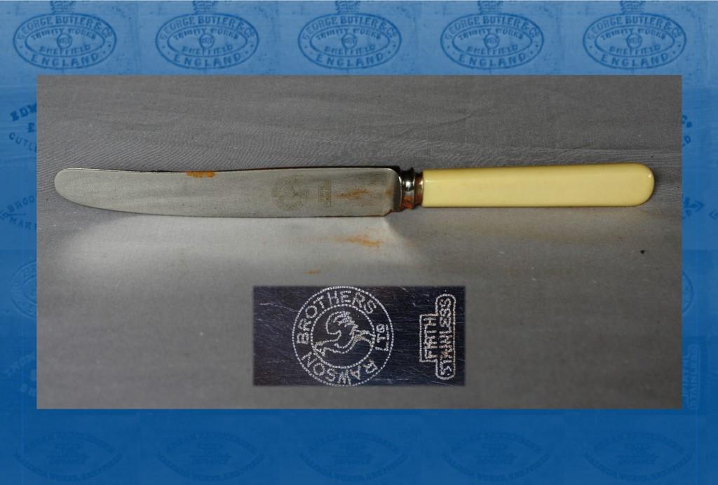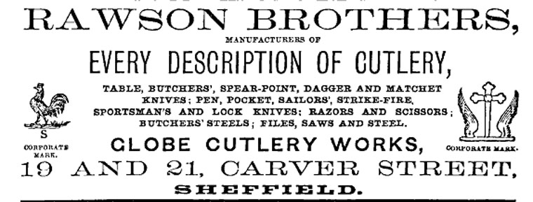 Rawson’s corporate marks included an altar cross between two wings (granted in 1870); and a cockerel with the letter ‘S’ (assigned in 1875). It also acquired the name ‘LEWIS MURRAY’. Percy apparently took a keen interest in trade marking issues. In 1878, his firm took action against John Julian, a cutlery caster, for trade mark infringement. Rawson was reported to have visited Germany in 1890 to assess its alleged counterfeiting of Sheffield marks. On other occasions, his attitude to marking was more ambiguous. The name Globe Cutlery Works had echoes of the Globe Works of his previous employer. He encountered opposition from Lockwood Bros for using the latter’s ‘REAL KNIFE’ wording; and from Joseph Rodgers & Sons for using the name ‘John Rodgers & Sons’ (Sheffield Independent, 3 December 1889). In that year, Rawson Bros was a defendant in a trade mark action brought by file manufacturer John Baker & Sons. The case was protracted – lasting nineteen days – and typically convoluted (revolving around the arcane issue of circles enclosing the respective marks). The case ended in a costly stalemate that satisfied neither party (Sheffield Independent, 6 August 1890). The dispute rumbled on and evidently did not win Rawson friends everywhere. In 1890, The Birmingham Gazette criticised Rawson for exploiting the technicalities of trade mark law. The newspaper later published an apology, after Rawson alleged libel (Sheffield Independent, 27 April 1891).