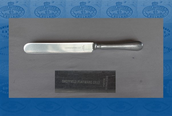 Advertisement from 1919 Established in 1913 (capital £15,000), this firm involved James Dixon & Sons, Walker & Hall, William Hutton & Sons, and Barker Bros (Birmingham). They licensed the American Wilzin process, in which spoons and forks were pressed into shape under heavy dies. Herbert Hutton Jun. and his brother Robert S. Hutton had a major share in the company – though Wm. Hutton’s share was small, and Sheffield Flatware was separate from West Street Works. It was based in Solly Street, where plant was designed to manufacture two tons of spoons and forks a week. However, the technology was untried and needed improvement and research (Hutton, 19561) – problems also encountered by Sheffield Silver Plate & Cutlery Co. The 500-ton presses soon had to be turned over to the wartime manufacture of forged shell heads and steel base plates. By 1917, Robert S. Hutton had become absorbed by motion studies and operational works research. In 1923, Herbert Hutton Jun. resigned, because of family rivalries and the firm’s poor performance, and this led to the factory’s liquidation. 1. Hutton, R S, ‘Notes on the History of William Hutton & Son’ (1956), typescript in Sheffield City Library Local Studies