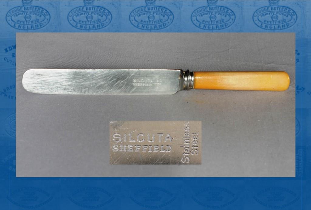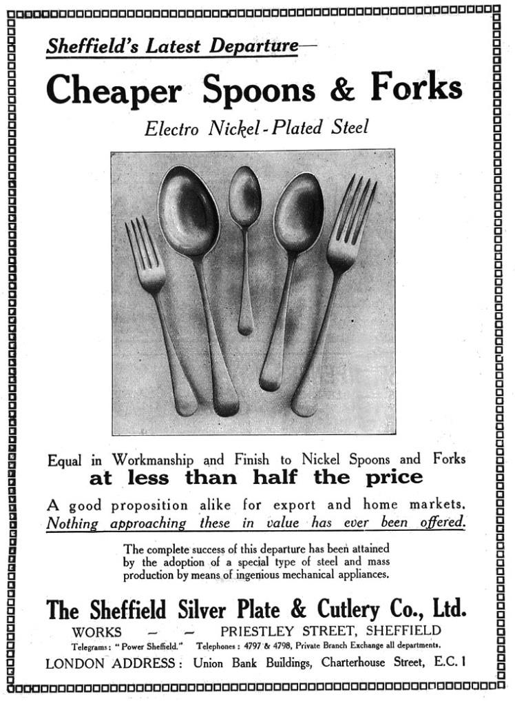 But the Wilzin process was a failure (and so, too, at Sheffield Flatware). According to J. N. Mappin Fraser (1957)1, the dies and tools constantly broke. In 1923, Mappin & Webb reverted to the old methods and reorganised the firm with £10,000 capital. Mappin & Webb’s main Queen’s Road factory was now adjacent to the Priestley Street plant. SSP&C remained at that address until the 1960s. Its cutlery was marked ‘SSP & C. Co Ltd EPNS’, or ‘FIRTH STAINLESS’, or ‘SILCUTA’, ‘SILTONA’, and ‘NOLBOGRECE’.