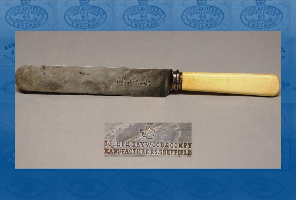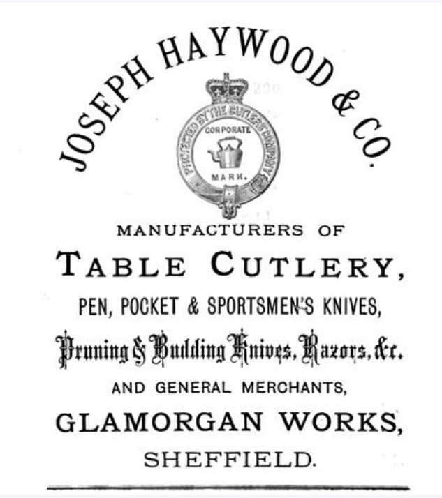 Joseph’s son, Arthur Haywood (1855-1936), took over the business. Within only two years he was bankrupt. At a hearing at Preston bankruptcy court, he denied living beyond his means by spending money on a party trip to the Lake District and on champagne and wines, ‘believing he had a considerable interest under his father’s will’ (Sheffield Independent, 22 March 1890). He was living on his own means by the 1890s and had retired completely. In 1902, the firm’s marks, goodwill, and stock of electro-plate and premium sportsman’s knives were offered for sale (Sheffield Daily Telegraph, 18, 19 March 1902). The goodwill and marks of the business at Glamorgan Works, Pond Street, were sold for £660. The purchasers were Needham, Veall & Tyzack and Thomas Turner & Co, who purchased them co-jointly. The agreement was that Turner’s would continue the pocket-knife department; Needham, Veall would carry on the table, razor, scissors, and electro-plate department. Both firms would have the right to strike the ‘kettle’ on their respective goods. In the Census (1911), Arthur was living in Crookes as a ‘late cutlery manufacturer: now out of’. He died in Barlow Moor Road, Crookes, on 9 October 1936. He left £98 to his widow, Alberta.