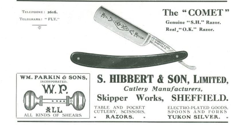 After the War, Hibbert’s was in Charlotte Street, but in 1929 S. Hibbert & Son (Sheffield) Ltd was incorporated at 32 Mappin Street (capital £100). Charles M. Hibbert, Clarkegrove Road, died on 21 April 1938, aged 79, and was buried in an unconsecrated grave in the General Cemetery. He left £902. The trade mark on cutlery was ‘SKIPPER’; on flatware ‘YUKON SILVER; and on razors ‘COMET’, ‘SH’, or ‘OK’. Hibbert acquired the door handle mark of Wm. Parkin & Co Ltd. By 1953, J. W. Haigh owned ‘SKIPPER’.