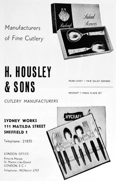 In the late 1950s, Bert had also developed links with the Irish Cutlery Co Ltd in Enniscorthy, County Wexford. In 1968, he acquired a controlling interest in this firm, which manufactured stainless steel spoons and forks. However, the abolition of Ireland’s protective duties, when that country joined the EEC, hit trade and in 1975 Housley sold the business to Viners. H. Housley & Sons Ltd continued in Sheffield, with Bert and his wife as sole owners. In 1981, they moved to a more suitable factory in Edmund Road. Bert used his experience in operating grinding and glazing machines to adapt to mass-produced stainless steel cutlery. It had once produced mainly butchers’, chefs’, and shoe-makers’ knives sold to the trade. But Housley’s began to specialise in flatware, with registered designs, such as ‘NYCRAFT’ and ‘PEARLCRAFT’, which it sold directly to wholesalers in the UK and around the world. Pinchbecks became the firm’s London agent (see Wraggs). Other trade names included ‘TABLECRAFT’, ‘GOLD SEAL’, and ‘ELEGANCE’.