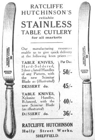 Ratcliffe Hutchinson (1887-1956) was born in Walkley, the son of John (a spring knife cutler, who later worked on his own account) and his wife, Fanny. Ratcliffe was trained as a cutler and by 1919 had acquired the Holly Street Works of Thomas Oxley. Hutchinson’s enterprise moved to Rockingham Street in the 1920s, Cavendish Street in the 1930s, and Victoria Street between the 1940s and 1967 (when it was dissolved as a limited company). Besides spoons and forks, Hutchinson marketed table knives in shear and ‘FIRTH STAINLESS’ steel and also cased sets of table cutlery. Ratcliffe Hutchinson, Upholme, Blackmoor Crescent, Dore, died on 20 June 1956, aged 68. He left £27,186.
