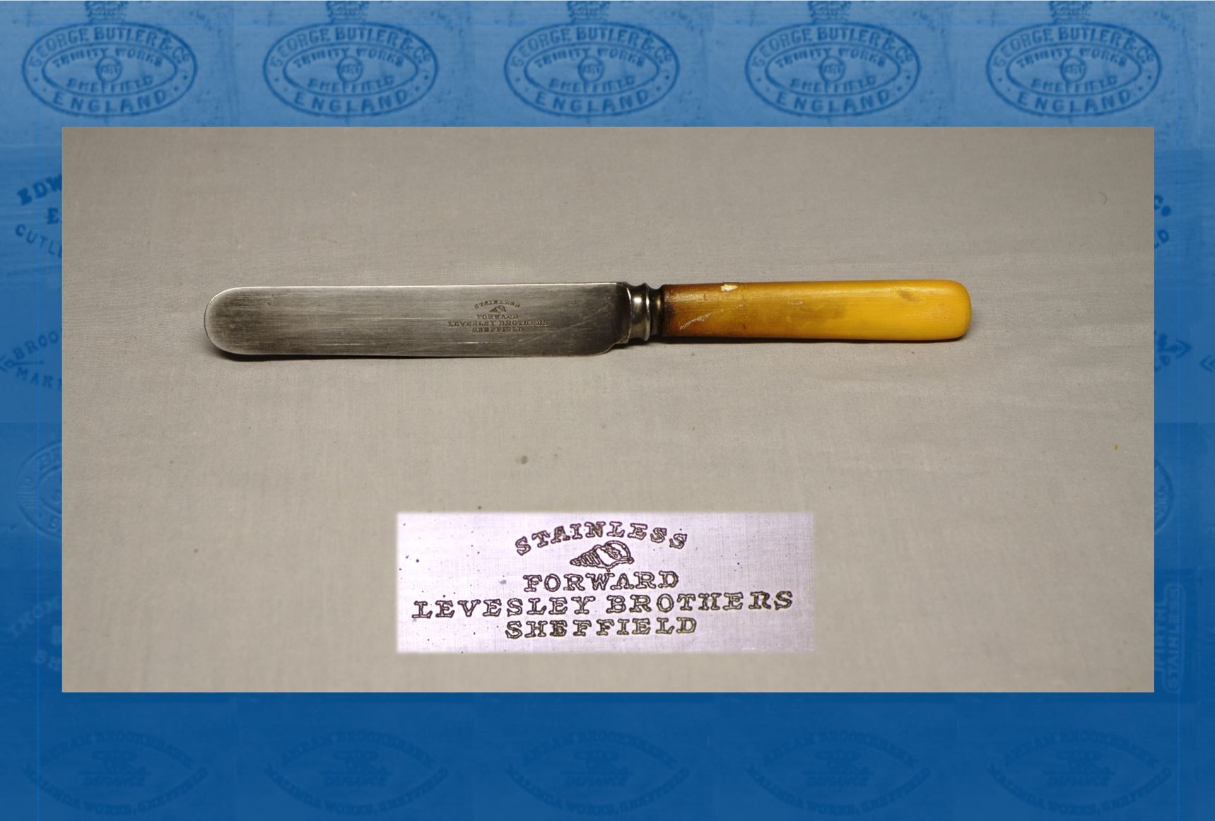 Thomas continued to run the business, with the help of his son William Charles. The firm had a London showroom by the 1890s, when the business was briefly restyled as Levesley Bros & Lloyd. It concentrated on silver and electro-plate, and table and spring cutlery. Levesley Bros registered silver marks in 1863, 1868, 1890 (as Levesley Bros & Lloyd), and 1893. An 1892 advertisement showed silver-plated trowels and elaborately carved ivory mallets that were intended for Masonic rituals. Thomas Levesley’s partnership with William Lloyd terminated in 1893. In the 1890s, Thomas Levesley had left Sheffield for Buxton, but returned to live in Western Bank. Levesley Bros continued at Central Works in Mary Street. After 1918, Thomas and William Charles were still listed as the partners in directories. Thomas died at Western Bank on 2 October 1924, aged 94, leaving £3,067. The business apparently then passed to Leonard Walter Levesley, Thomas’s other son, who was the only remaining partner when the firm declared bankruptcy in 1929. It was listed briefly at 203 Arundel Street until the early 1930s. William Charles Levesley, of Endcliffe Rise, died on 19 March 1940, aged 86, leaving £1,234. His brother, Leonard Walter, apparently died in Bakewell in 1940. Trade marks included ‘CLEAN SHAVE’ on razors, with a picture of a batsman taking guard (later used by Joseph Allen); and a sea shell with the word ‘FORWARD’ (later acquired by E.M. Dickinson).