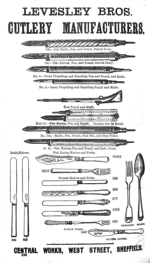 Levesley Bros was listed in 1862 as a cutlery manufacturer in Central Works, West Street. The partners were Charles, William, and Thomas (born in 1821, 1826, and 1831, respectively, according to a pedigree in the Hawley Collection). They were the sons of William, a pearl and ivory carver, and his wife, Mary. In 1841, the family lived in Hoyle Street. William Levesley is a name that has been mentioned in connection with the start of the steel pen trade in Sheffield (Bore, 18901), though the identification remains uncertain. William’s sons followed him into the trade. Charles was working in his own right by 1849 as pearl carver and dressing case instrument manufacturer in Orchard Lane. He was amongst the most skilled carvers in the trade. John Hinchliffe and Joseph Rodgers & Sons are said to have relied upon him to carve the pearl handles of their display knives for the Great Exhibition in 1851. If so, the remarkable carving on the Norfolk Knife is a testament to his skills. Levesley Bros concentrated on dessert knives, fish carvers, fish eating knives and pickle forks ‘in every variety’, pencil-knives, and dog calls [whistles]. William Levesley Jun. retired in 1865. In 1868, a trade advertisement featured Levesley Bros’ pencil-knives in ivory and fluted pearl. In 1871, Charles was living in Mount Pisgah and, according to the Census, employed ten men, six boys and three girls. In 1876, the business moved to Bow Street and three years later to Mary Street. In 1881, Charles stated that the firm employed three men and three boys. Three years later, he withdrew. Charles Levesley died in Ecclesall Road on 12 December 1891, aged 71. He was buried in St Thomas’s churchyard, Crookes, where his parents lay: Mary having died on 24 November 1867, aged 70; William on 15 February 1883, aged 85.